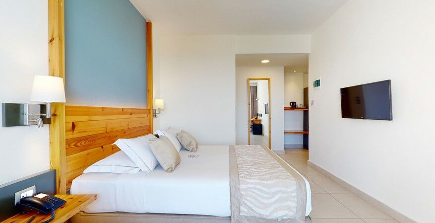 Les Chambres Doubles de 21 m² de l’Acrotel Elea Beach Hotel, situées au rez-de-chaussée de sept bâtiments, présentent un design minimaliste et offrent une vue imprenable sur la baie de Toroneos ou sur les jardins luxuriants de l’hôtel.
