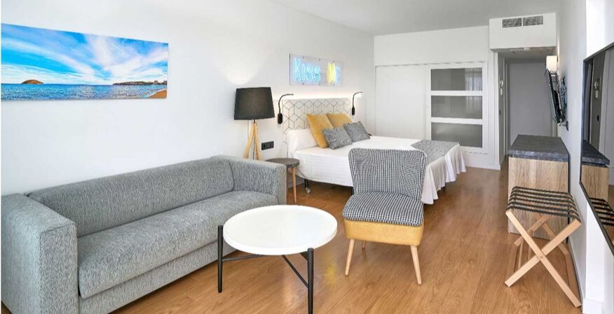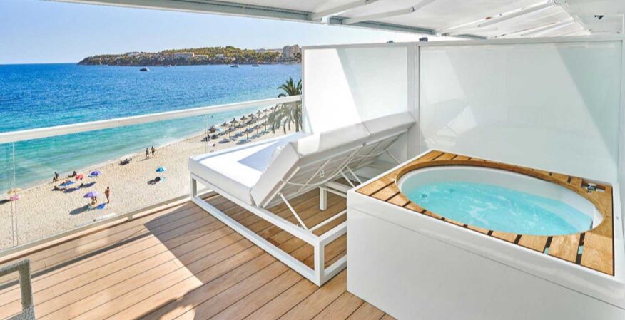 Cuenta con una terraza privada de 20 m2 con vistas al mar, amueblada con hamaca doble balinesa, mesa y sillas, además de bañera de hidromasaje. Encontrarás también sofá cama y butaca, minibar, cafetera y tetera, TV con canales internacionales. Esta habitación dispone de todos los servicios necesarios para una estancia de ensueño como aire acondicionado, Wi-Fi, baño completo con albornoz, zapatillas, secador de pelo y amenities especiales y toldo automático.
