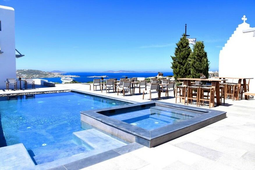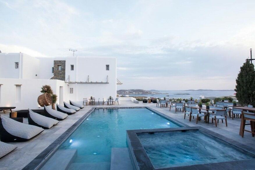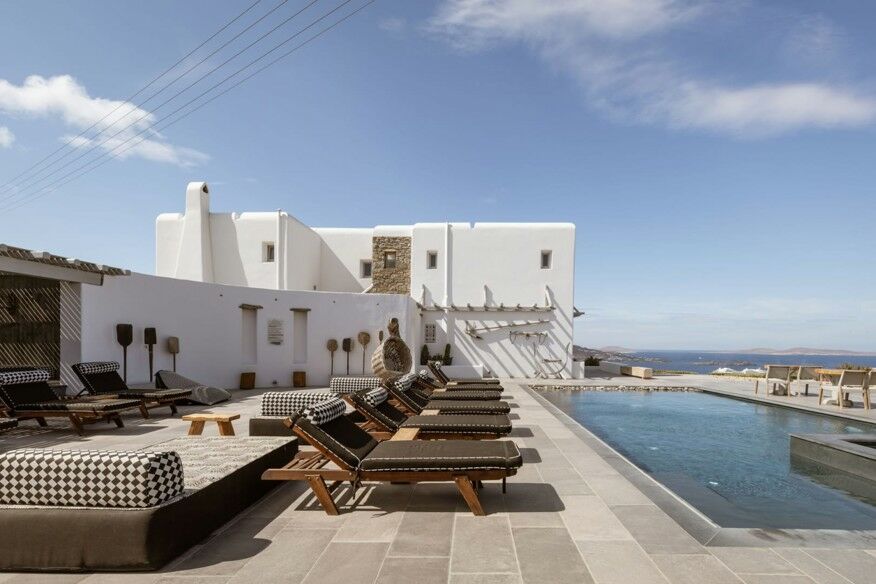 L’eau cristalline de la piscine, reflétant le ciel bleu des Cyclades, invite à un plongeon revigorant, tandis que le solarium environnant offre des coins tranquilles pour profiter du soleil de Mykonos en totale détente.