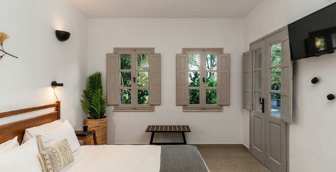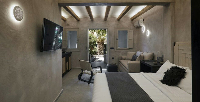 Les chambres Cocoon sont un refuge confortable alliant style et détente estivale. Baignées de lumière naturelle et décorées de tons doux et apaisants avec des détails en bois et métal, elles inspirent immédiatement la relaxation et vous feront vous sentir chez vous dès que vous franchissez le seuil, tout au long de vos vacances à Santorin ! Situées au rez-de-chaussée, elles disposent d’un lit double et d’un canapé-lit pour un invité supplémentaire (sur demande), s’ouvrant sur la piscine ou les jardins luxuriants du complexe.