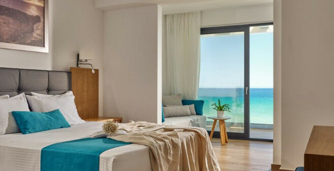 La Suite Seaside de 40 m² avec vue panoramique sur la mer et la plage de Zante. Elle dispose d’un lit king-size, deux canapés-lits et une salle de bain avec double vasque. Taille : 40 m².