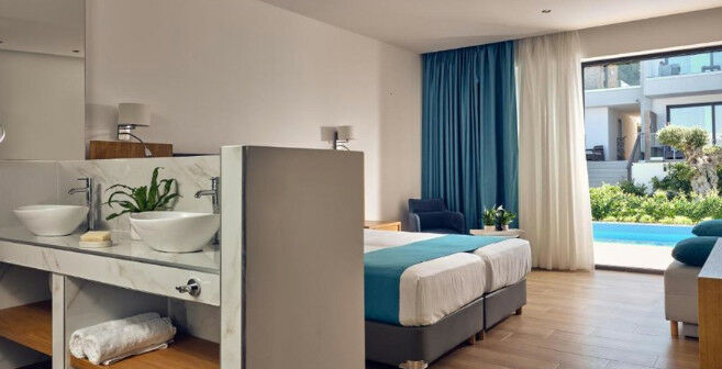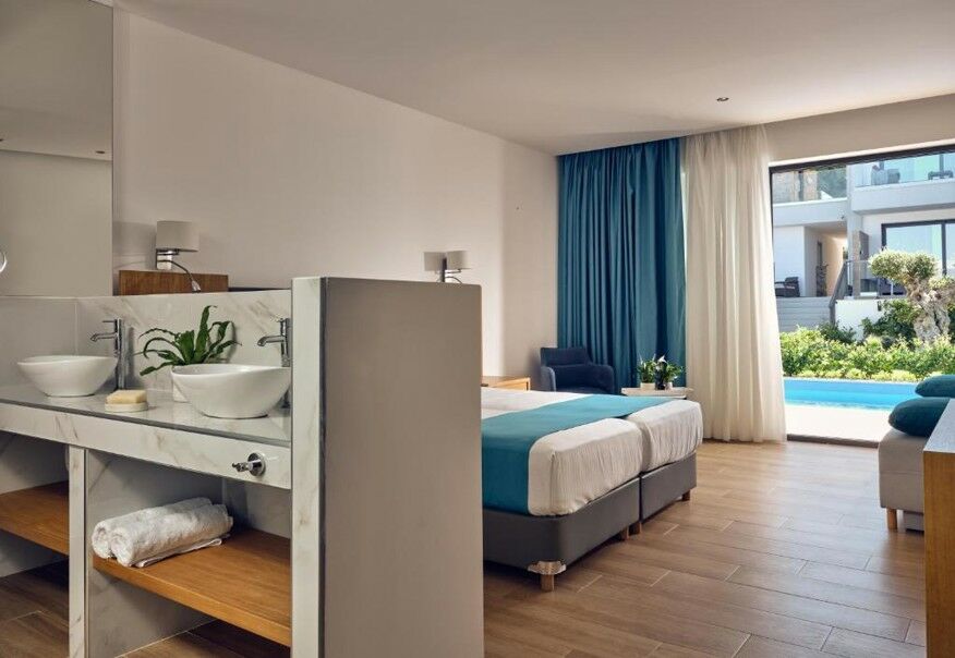 Suite Deluxe de 40 m² avec piscine privée, située à 300 mètres de la réception (annexe à 300 mètres) et à 350 mètres de la mer, dans une zone calme et reposante. Les chambres sont équipées d’une piscine privée, offrant détente absolue et exclusivité. Elle comprend un lit king-size, deux canapés-lits et une salle de bain avec double vasque. Taille : 40 m².
