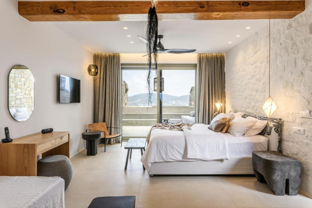 La Junior Suite du Panormos Bay Suites offre un refuge élégant et intime, alliant l’élégance moderne à l’esprit détendu de Mykonos. Dotée d’un lit king-size, d’un coin salon confortable et d’une terrasse privée, c’est l’espace idéal pour se détendre dans le confort et l’intimité après une journée au bord de la mer.