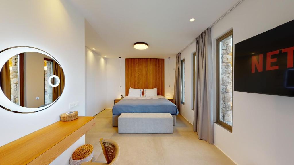La Signature Suite avec piscine privée au Panormos Bay Suites offre une expérience insulaire d’exception, alliant élégance contemporaine et intimité totale. Dotée d’une chambre spacieuse, d’un espace de vie raffiné et d’une vaste terrasse avec piscine privée surplombant la mer Égée, cette suite est conçue pour des moments inoubliables — des matinées baignées de soleil aux couchers de soleil romantiques en toute intimité.