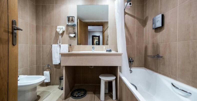 La chambre dispose d’un lit double ou de deux lits simples, ainsi que d’une salle de bain avec baignoire ou douche.